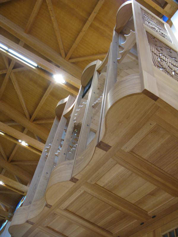 Pedaliera parallela e stesa, in rovere, di 26 pedali (Do1 – Re3, senza Do#1); testa dei cromatici sagomata e con inserto centrale in osso ed ebano.