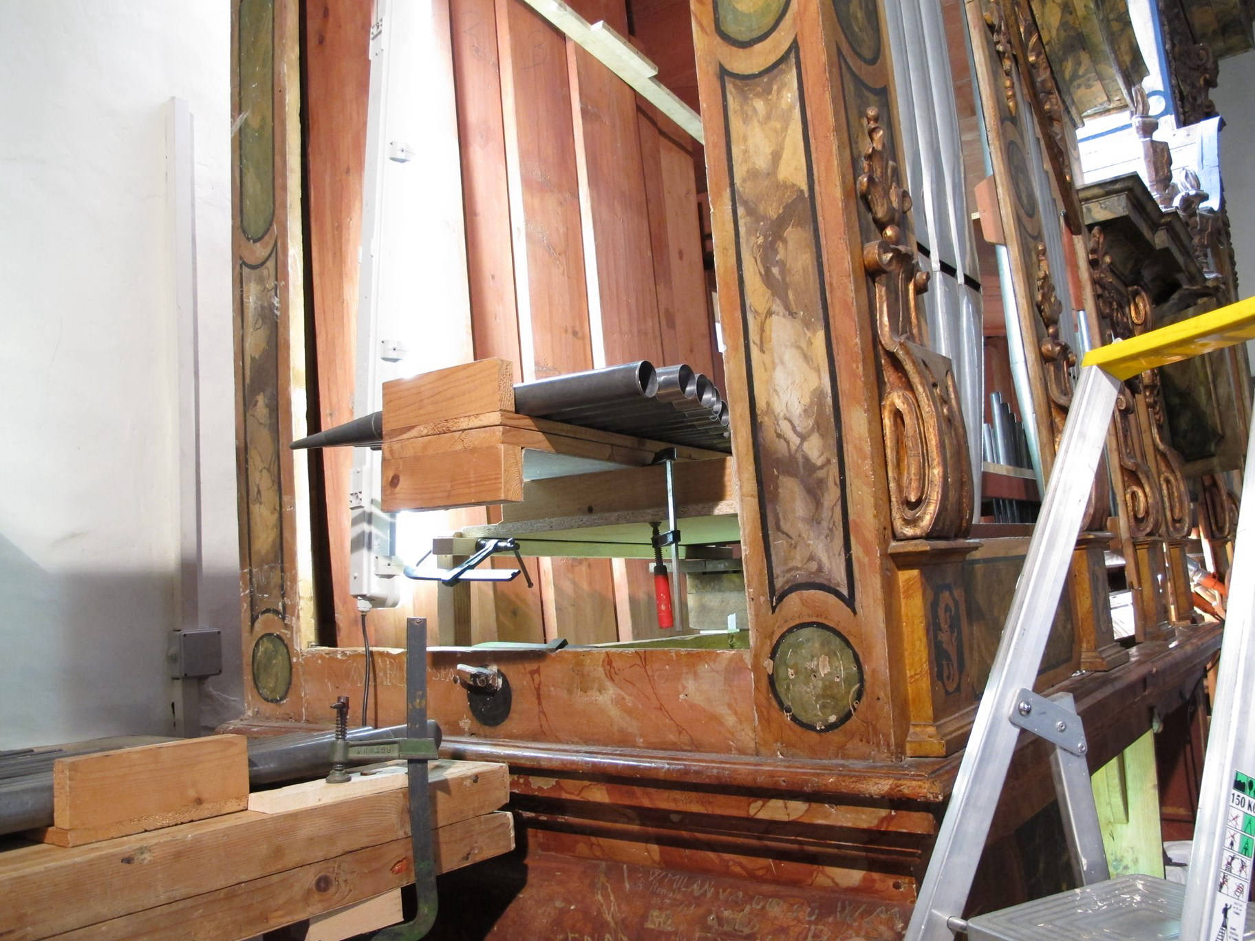 Canne interne: le prime due di Principale 8' e Ottava sono in legno; le altre in differenti tenore di lega e lavorazione con notazione numerica incisa e indicazione dei singoli registri sulla prima canna di ciascuno.