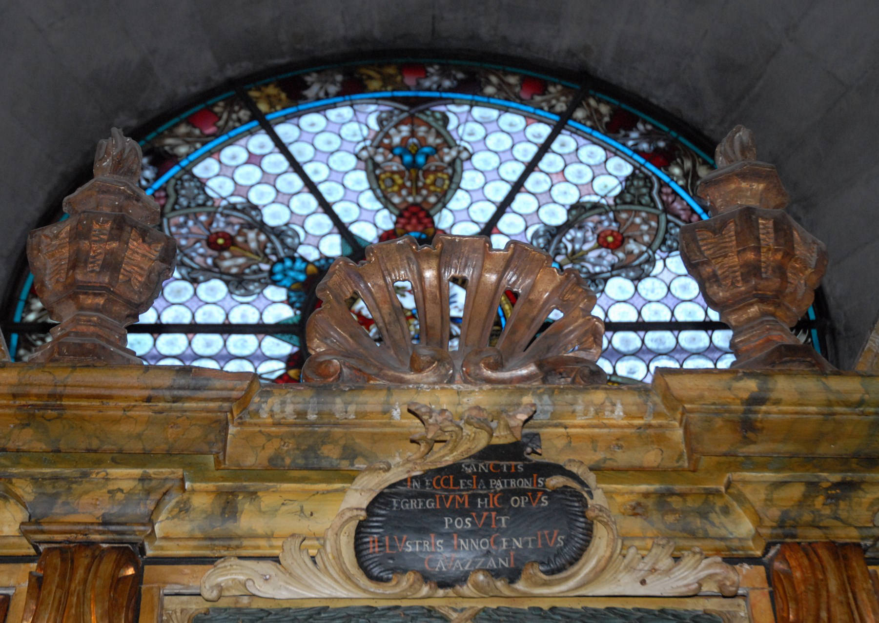 Al centro del fronte della Cassa, sopra la cassetta del Brustwerk, un cartiglio scolpito reca dipinto un cronogramma la cui soluzione rivela la data di costruzione dell'organo.