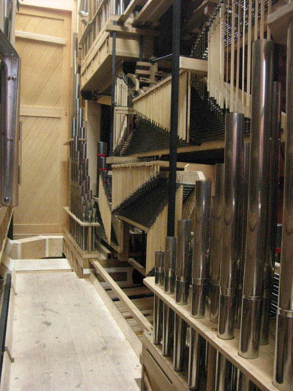Dei Manuali: a tiro e in rovere e divisi in due sezioni speculari sia per il G.O. che per il Positivo; ambedue presentano alcuni canali dedicati all’ancia e al Prestant; cintura, stecche, coperte, antine, morale e pavimento della secreta in rovere; ventilabri in cedro; molle in acciaio armonico e punte guida in ottone sbiancato; guarnizioni dei ventilabri in feltro e pelle di montone conciata all'allume di rocca; crivelli in rovere.