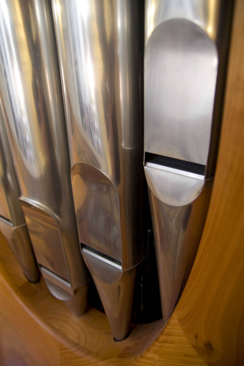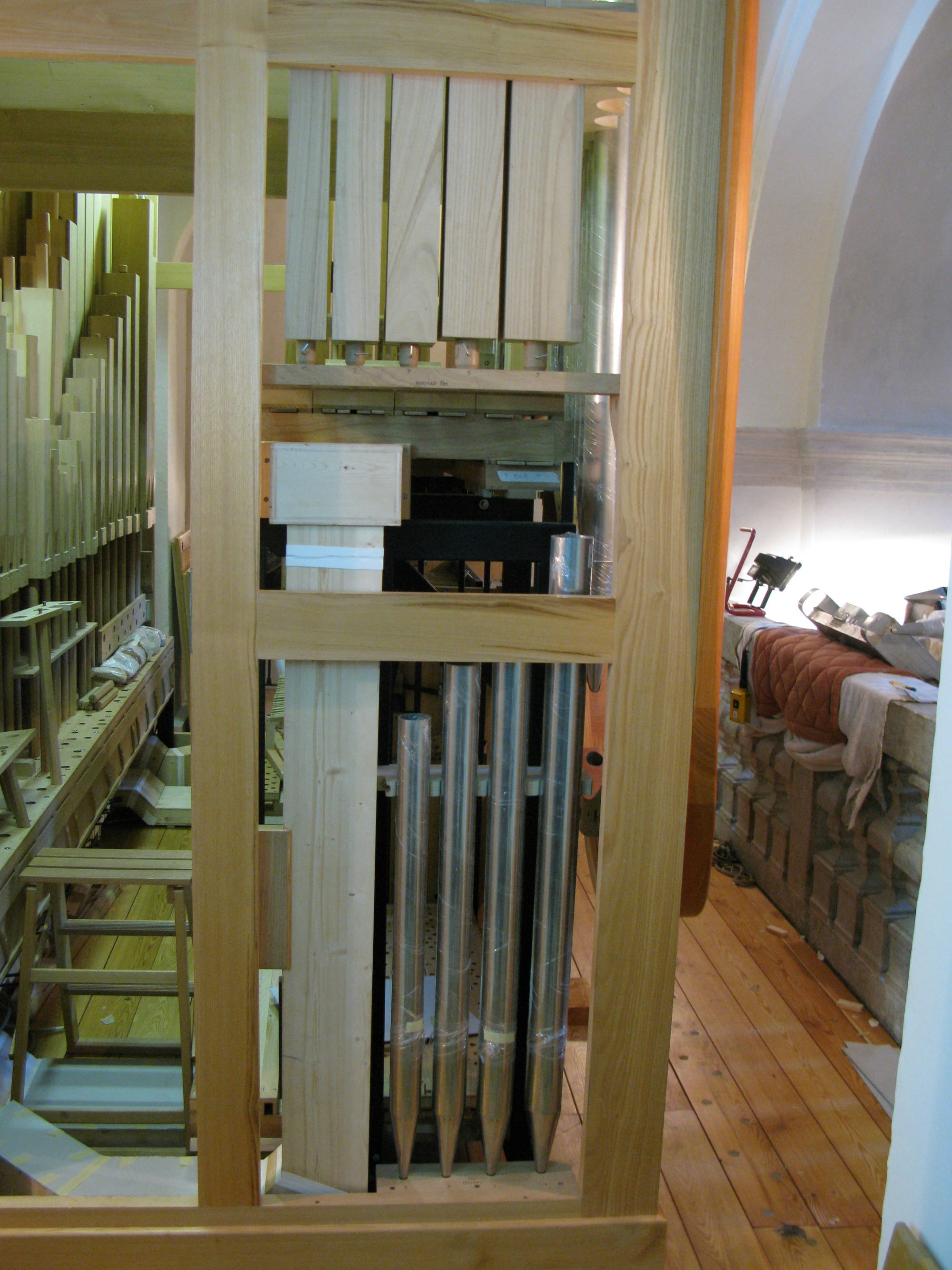 Facciata in stagno di 52 canne (2 mute); profilo piatto; labbro superiore a scudo stampato, nelle due canne maggiori riportato; piedi di altezza variabile; costituita per intero dal registro Montre 8’, da Do1 a Re5.