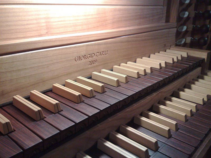 Comando dei registri a pomello, in palissandro con perla centrale in bosso; ad incastro i registri meccanici.