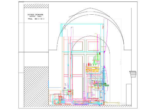 Del Pedale: a tiro e in castagno; essenza lignea a parte, stessa costruzione che per i somieri dei Manuali ivi compresi i canali dedicati all’ancia.